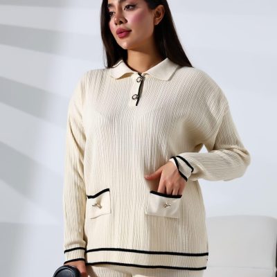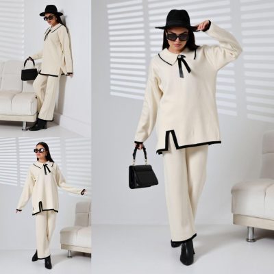 Compleu Tricot Femei, Doua Piese, Over Size, Casual, Alb Ivory