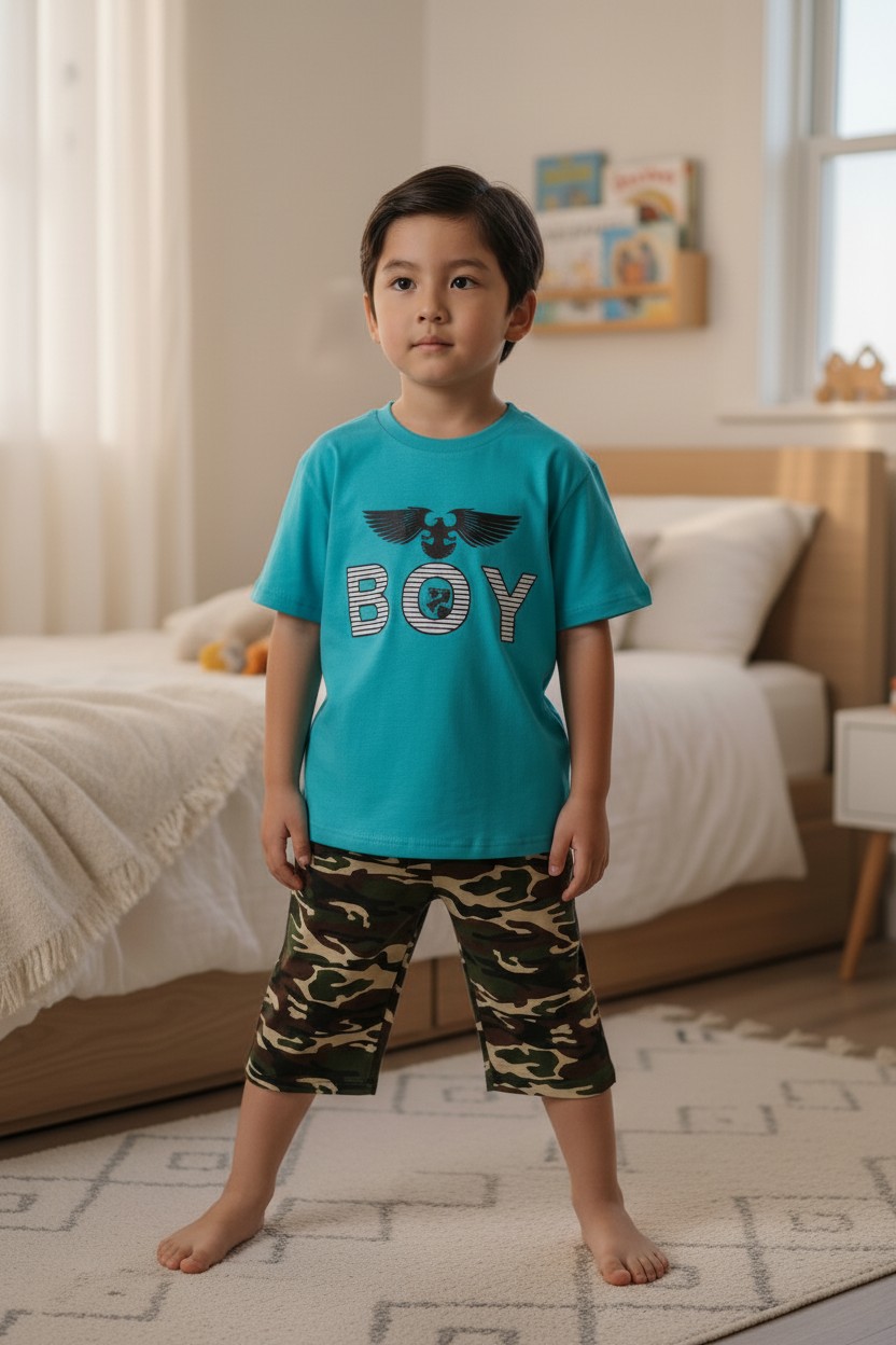 Compleu pentru copii cu tricou maneca scurta si pantaloni 3/4 cu imprimeu de calitate superioara. Compleul este lejer si delicat, confectionat din bumbac de calitare superioara astfel incat copilul tau sa se simta relaxat si confortabil. Alege masura potrivita 3,4,5,6 sau 7 ani.