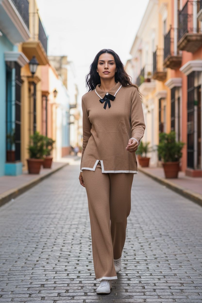 Acest compleu casual, confecționat din tricot fin de densitate mare, este ideal pentru un look confortabil și elegant.