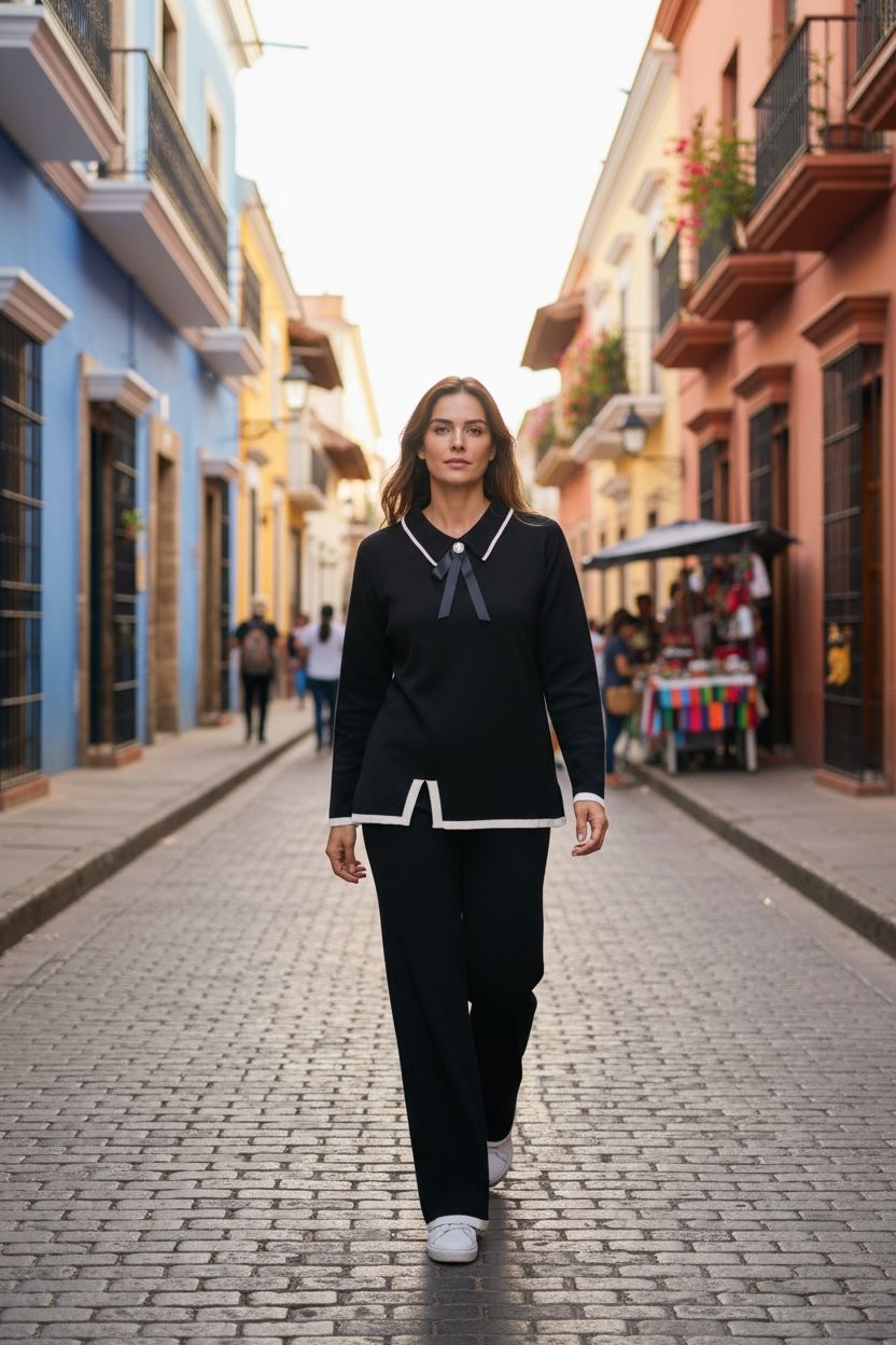 Acest compleu casual, confecționat din tricot fin de densitate mare, este ideal pentru un look confortabil și elegant.