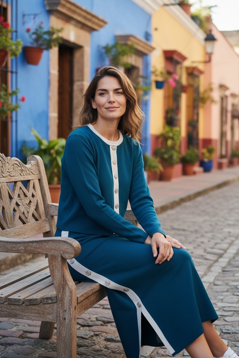 Acest compleu casual, confecționat din tricot fin de densitate mare, este ideal pentru un look confortabil și elegant.