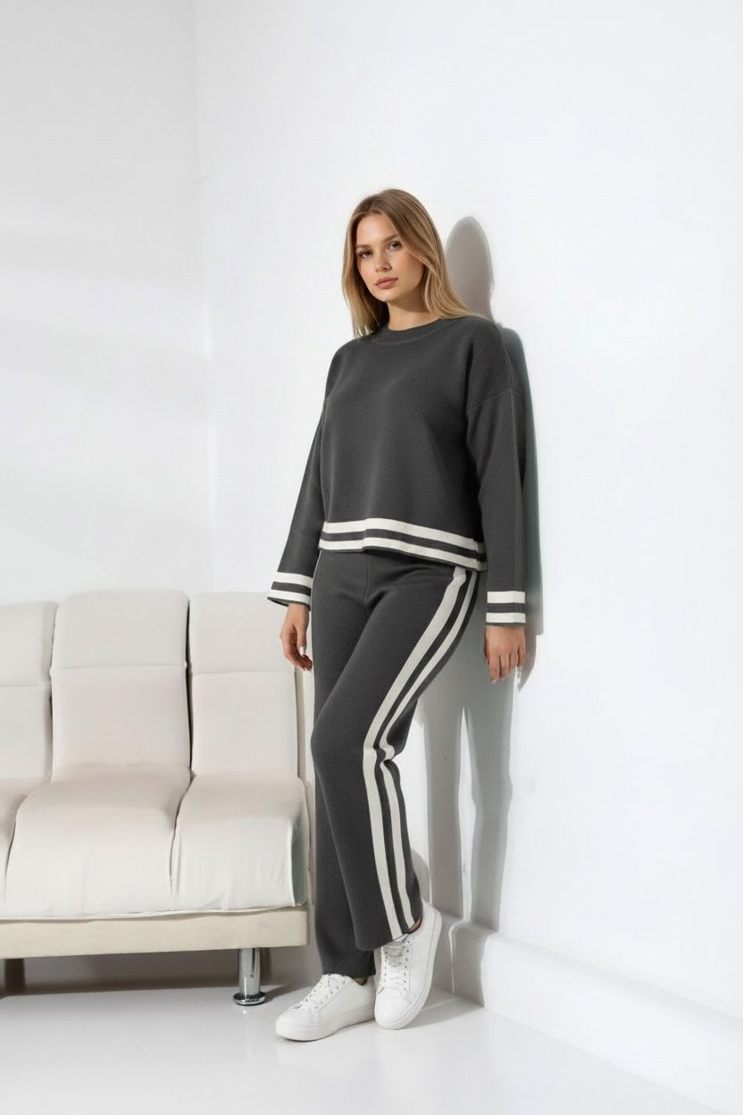 Acest compleu casual, confecționat din tricot fin de densitate mare, este ideal pentru un look confortabil și elegant.