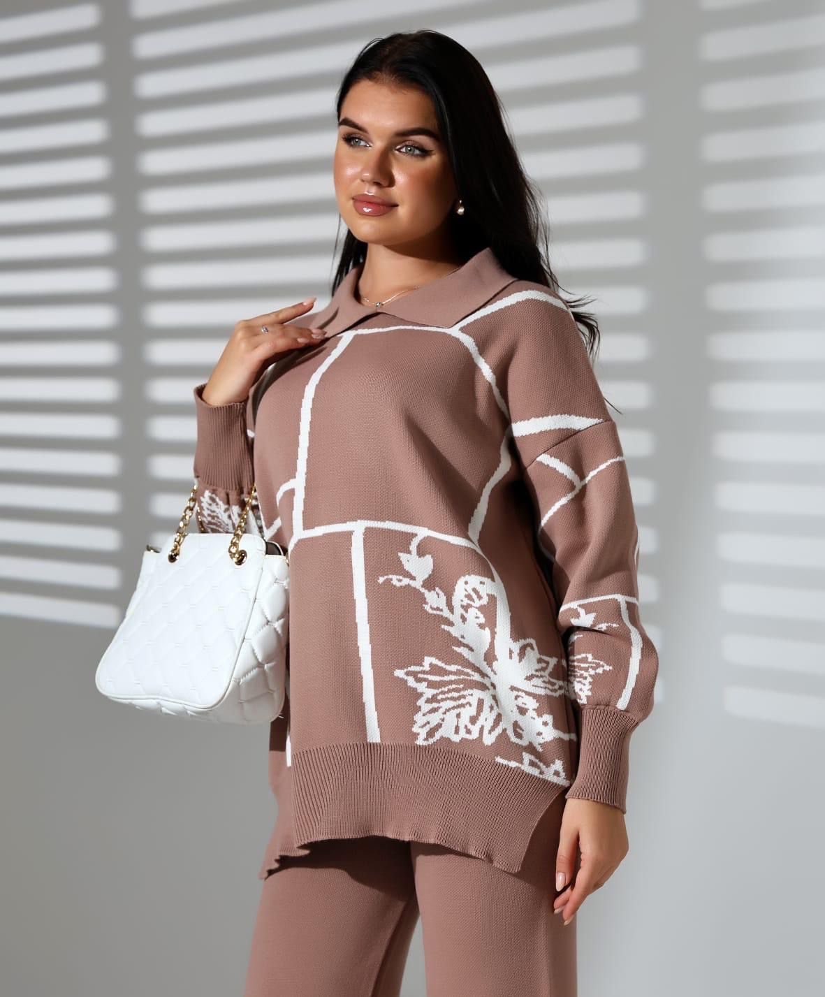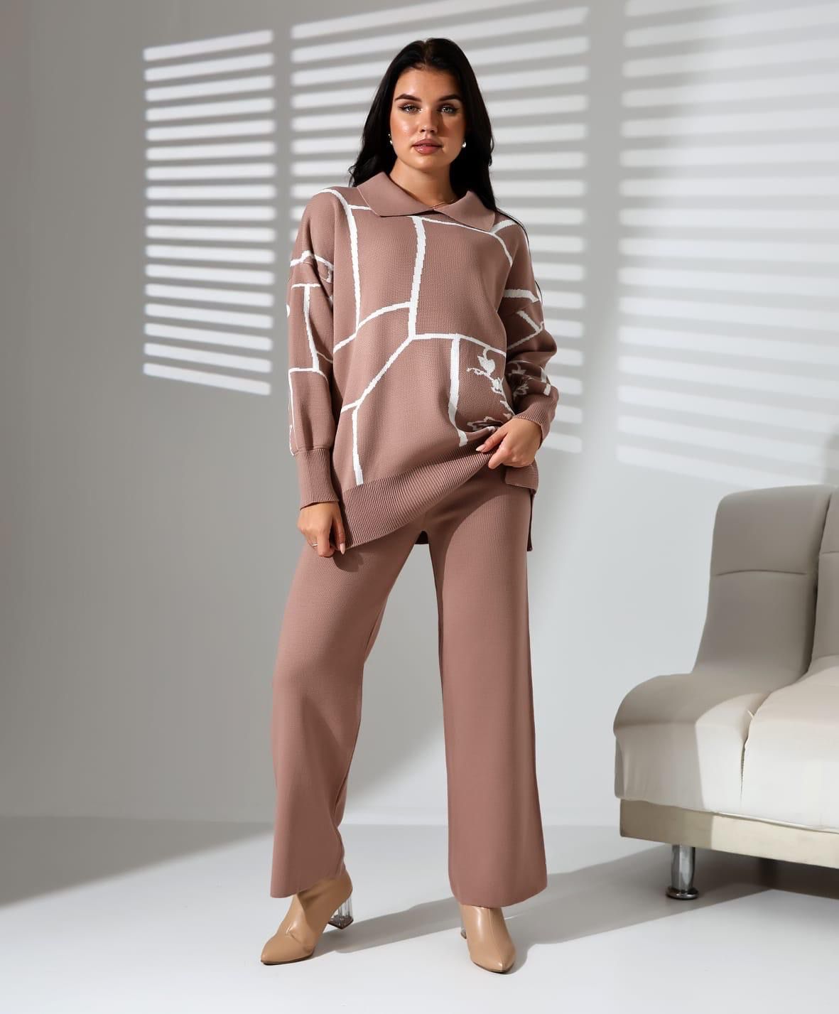 Acest compleu casual, confecționat din tricot fin de densitate mare, este ideal pentru un look confortabil și elegant.