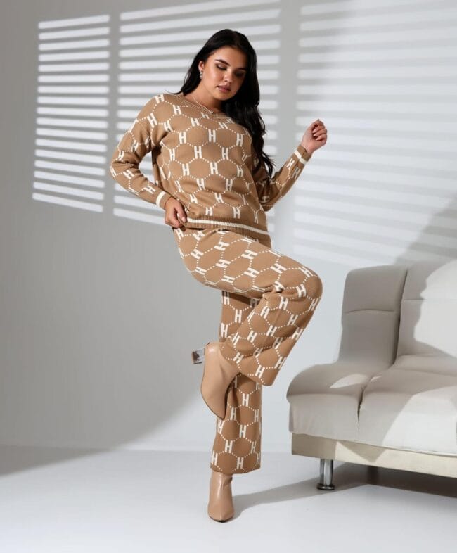 Acest compleu casual, confecționat din tricot fin de densitate mare, este ideal pentru un look confortabil și elegant.