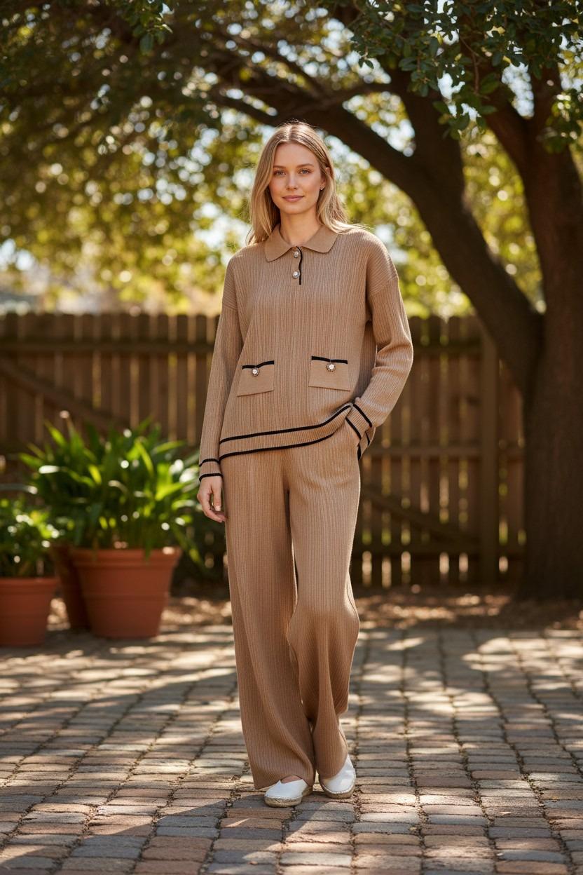 Acest compleu casual, confecționat din tricot fin de densitate mare, este ideal pentru un look confortabil și elegant.