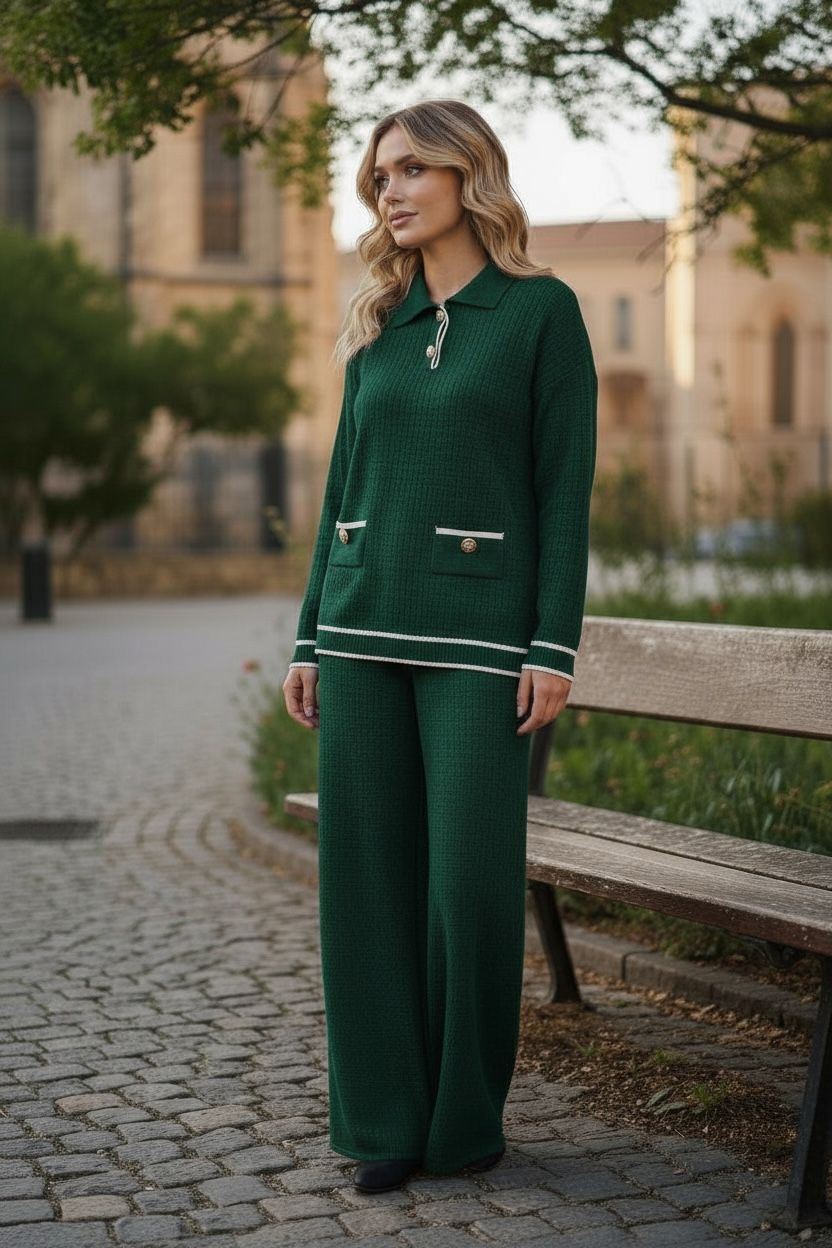 Acest compleu casual, confecționat din tricot fin de densitate mare, este ideal pentru un look confortabil și elegant.
