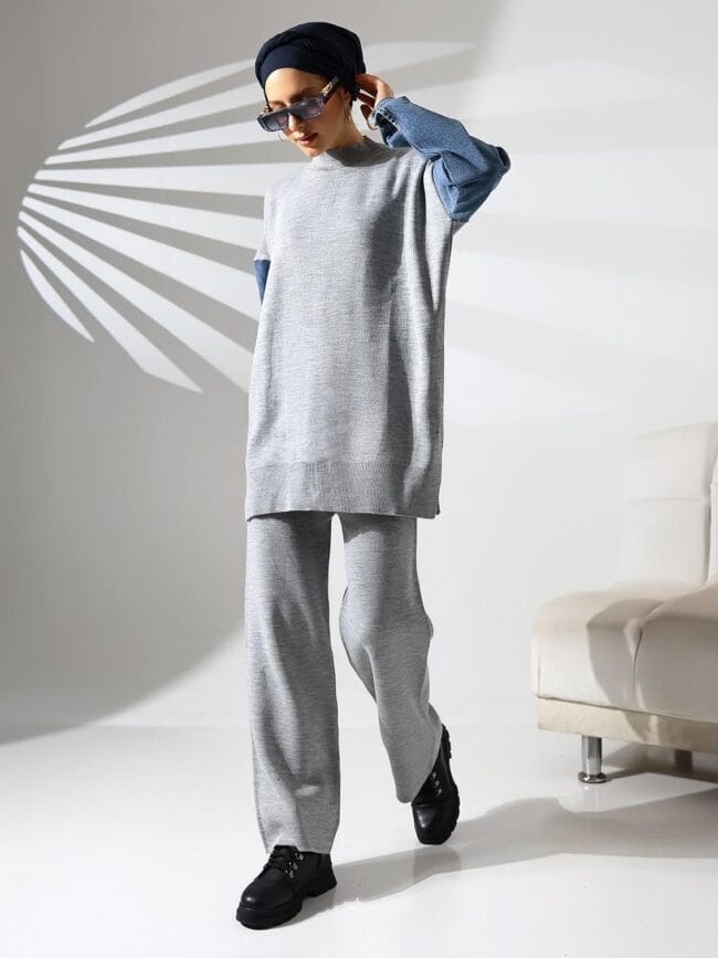 Compleu Tricot Femei, Doua Piese, Over Size, Maneca Denim, Gri