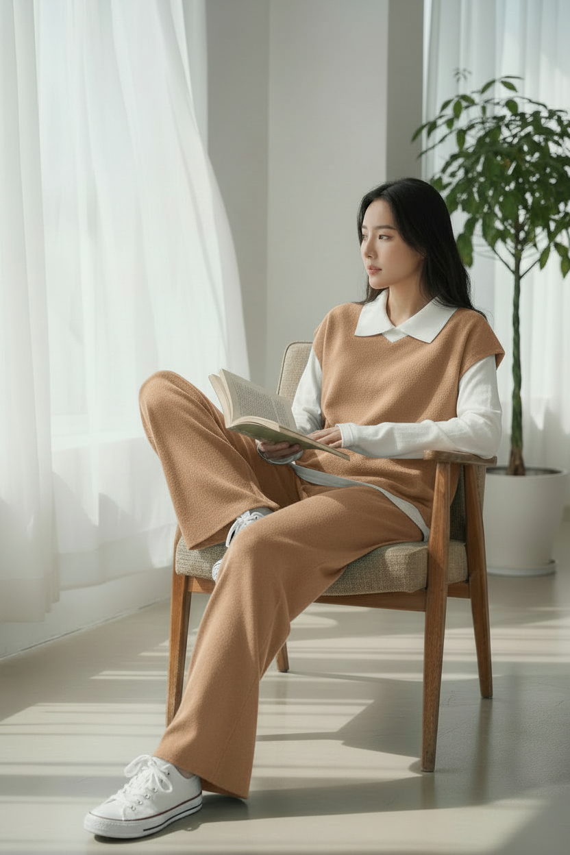 Acest compleu casual, confecționat din tricot fin de densitate mare, este ideal pentru un look confortabil și elegant.
