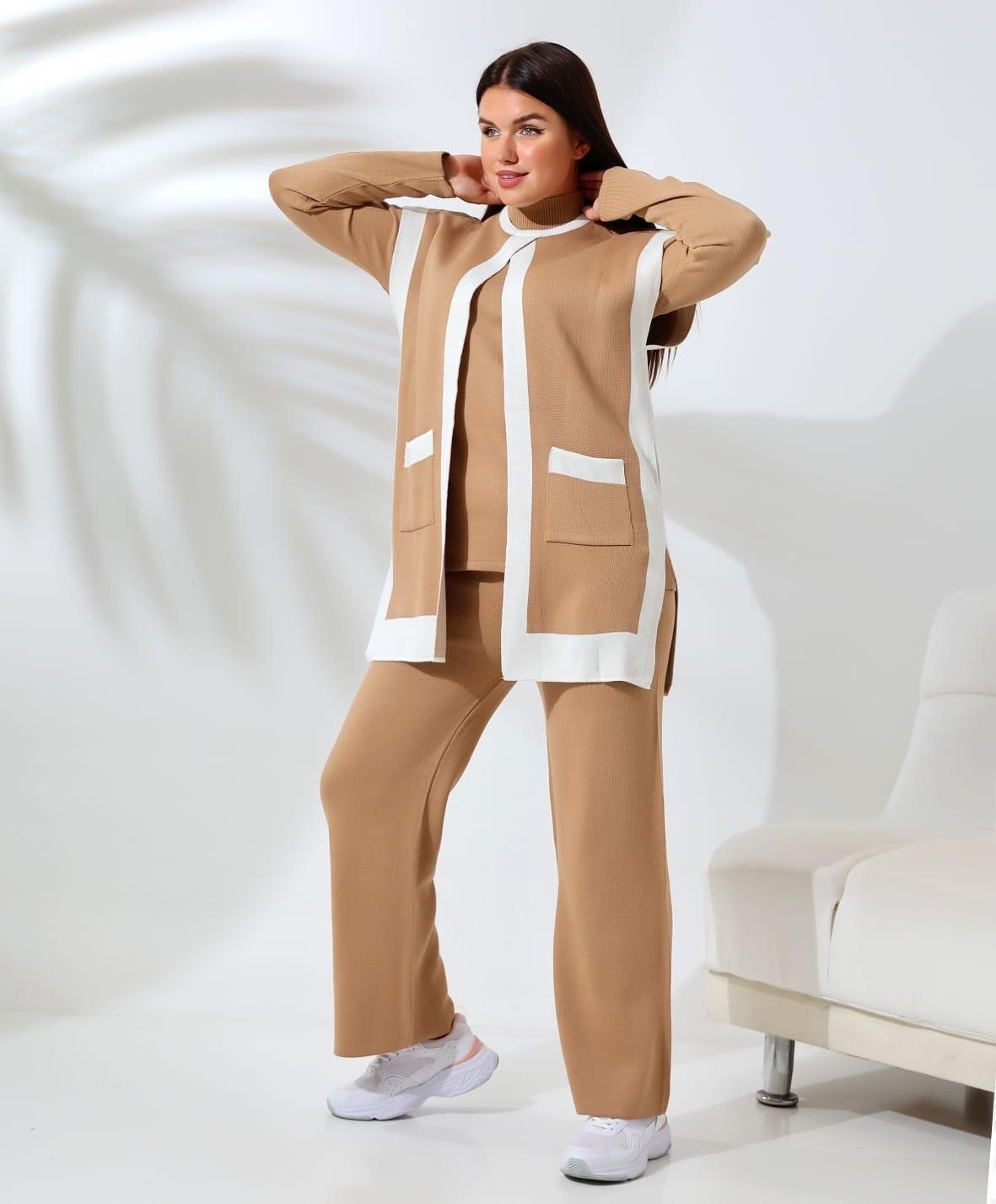 Compleu Tricot Femei, Trei Piese, Clasic, Maro Deschis/Alb
