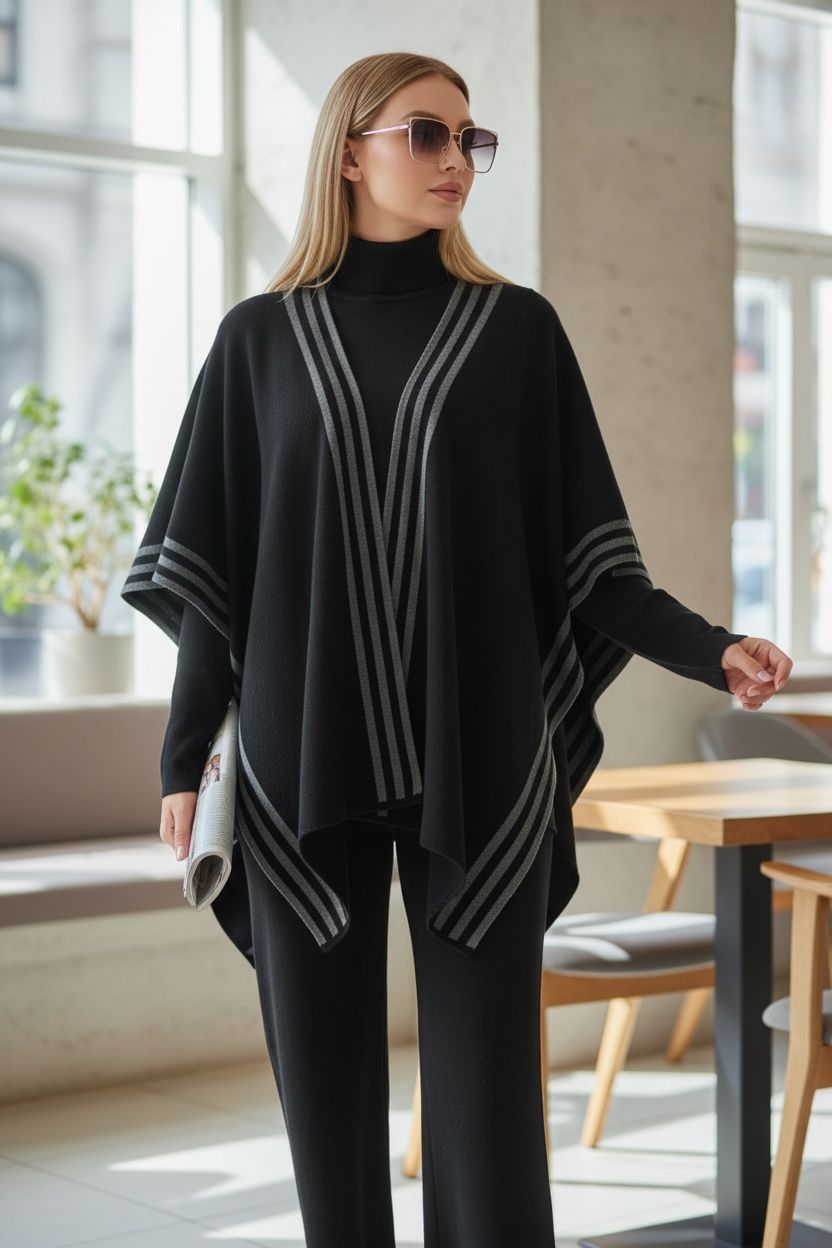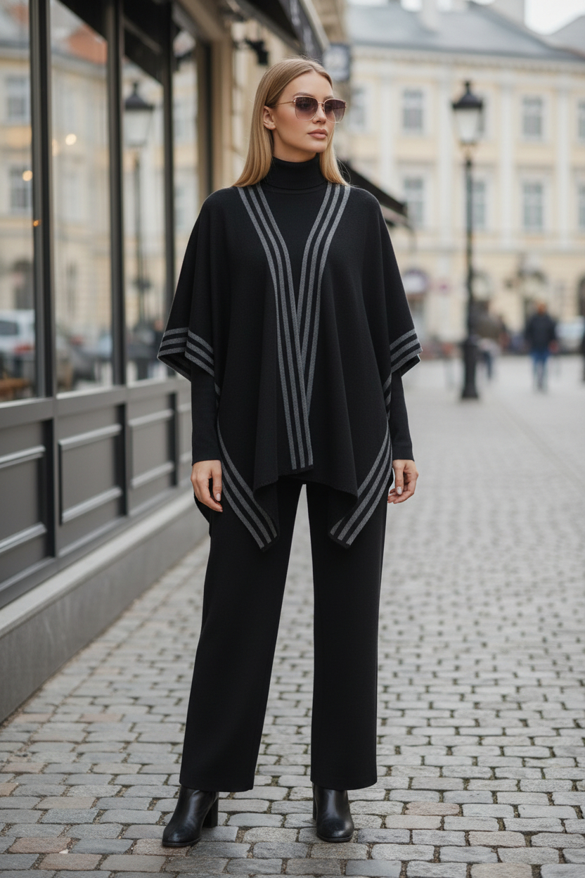 Setul este compus din pantaloni lungi cu croială lejeră, bluză tip helancă și poncho modern care completează armonios ținuta.