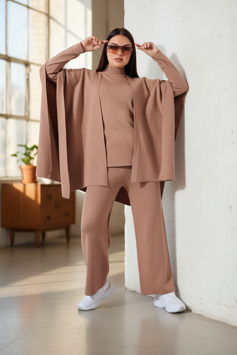 Setul este compus din trei piese: pantaloni largi cu croială lejeră, bluză cu guler înalt și un cardigan tip capă, amplu, care oferă fluiditate și rafinament ținutei.