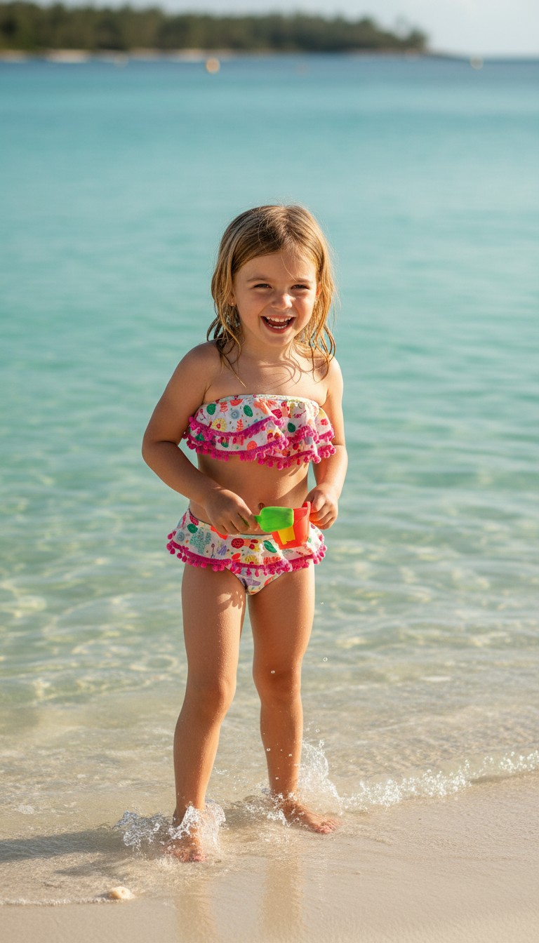 Costum de baie din două piese pentru fetițe, decorat cu volănașe și desene, perfect pentru un look jucăuș și plin de energie la plajă sau piscină.