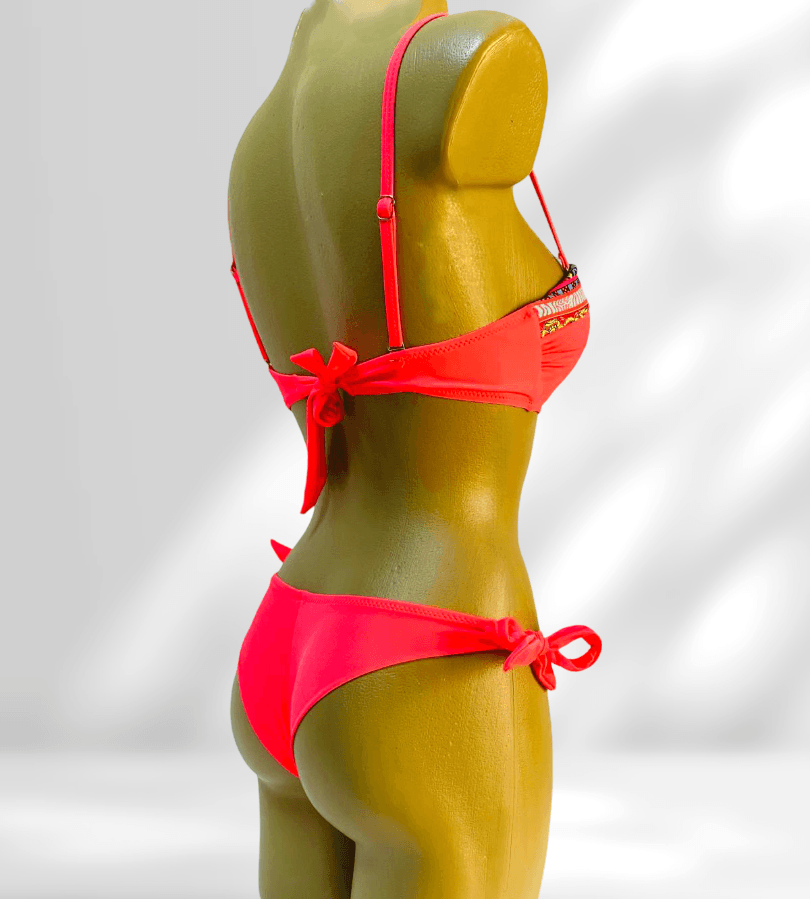 Costum de baie din două piese, în nuanță roz neon, perfect pentru un look îndrăzneț și feminin. Sutienul are bretele reglabile și se prinde la spate, iar chilotul brazilian, cu prindere laterală, adaugă un plus de senzualitate și stil.