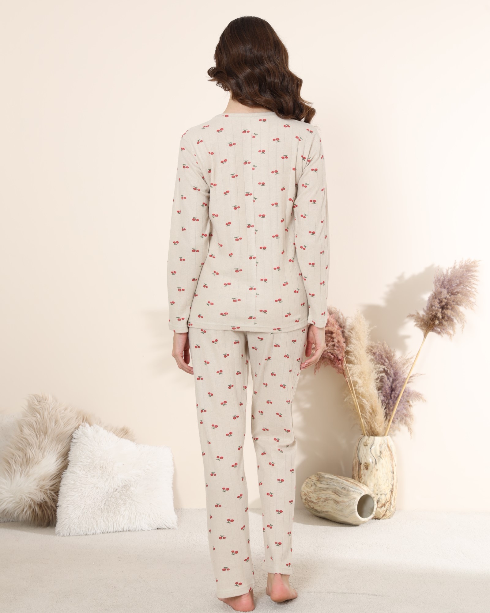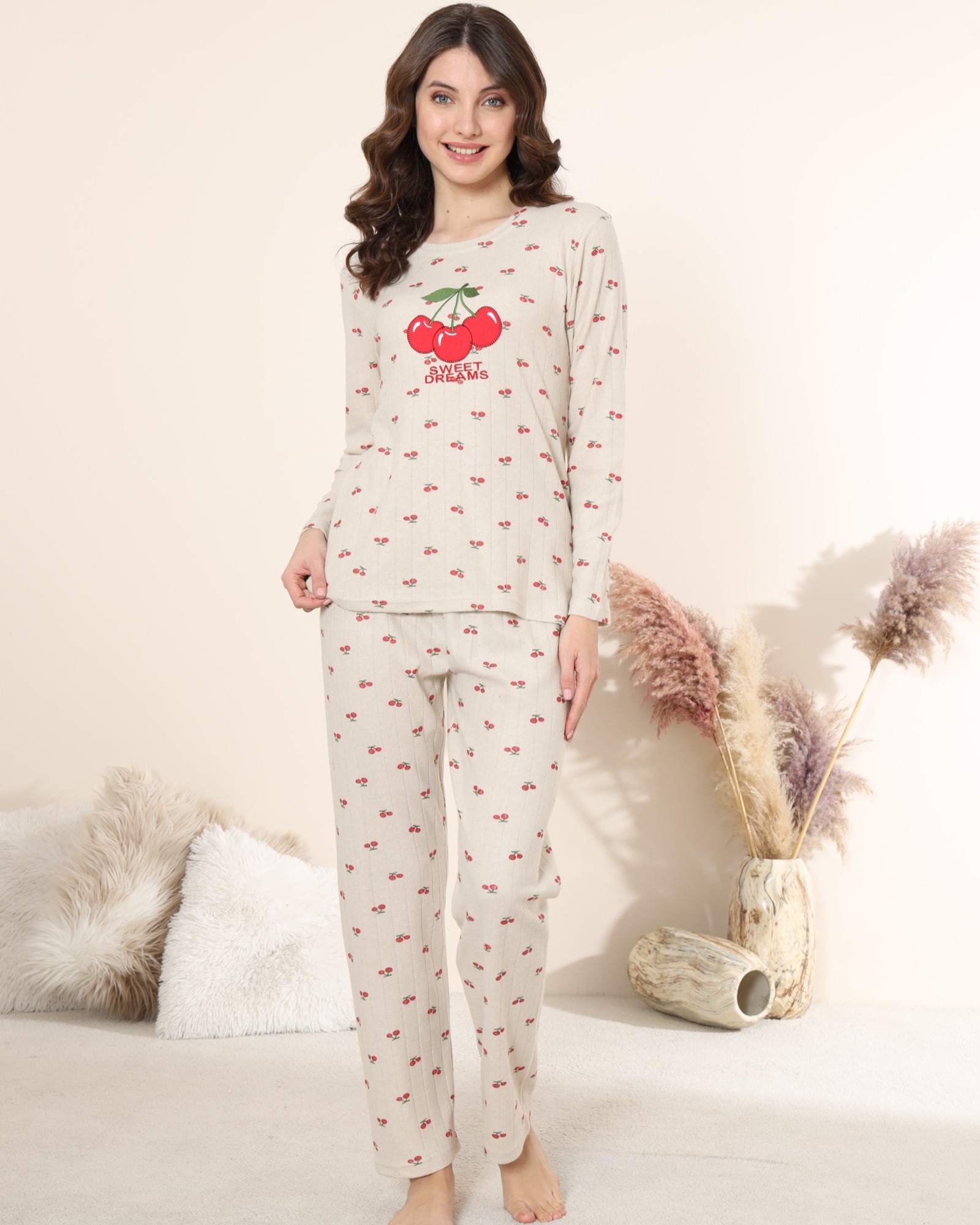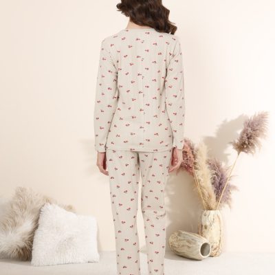 Pijama de casa cu maneca lunga si pantaloni lungi cu imprimeu de calitate superioara. Pijamaua este lejera si delicata, confectionata din bumbac  astfel incat sa te poti simti relaxata si confortabil acasa.
