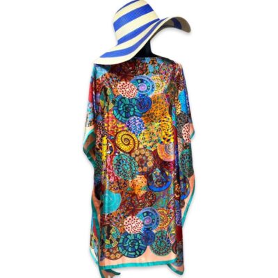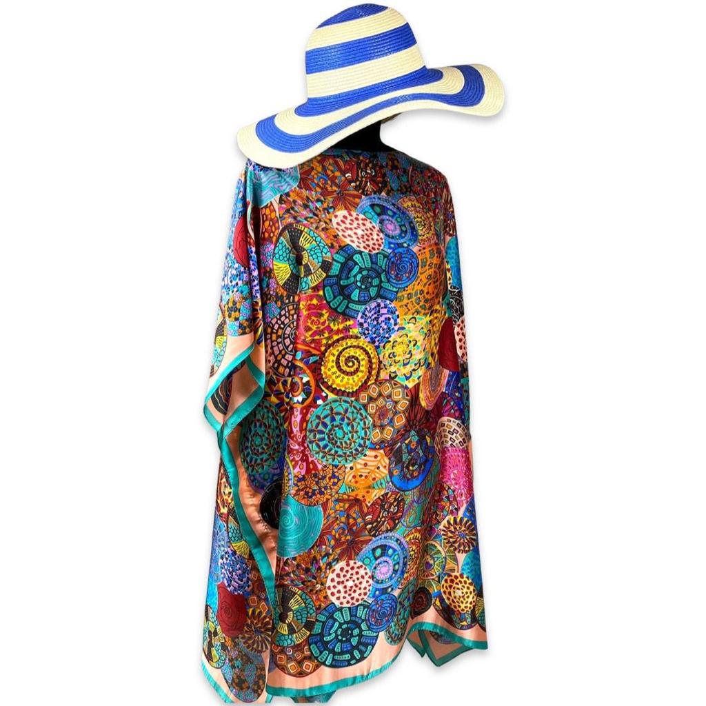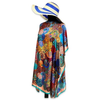 Pareo cu imprimeu artistic din matase potrivit pentru plimbarile pe litoral vara.