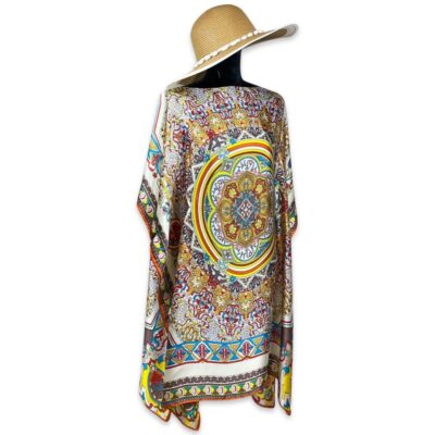 Pareo cu imprimeu artistic din matase potrivit pentru plimbarile pe litoral vara.