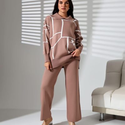 Compleu Tricot Femei, Doua Piese, Over Size, Casual, Maro Inchis